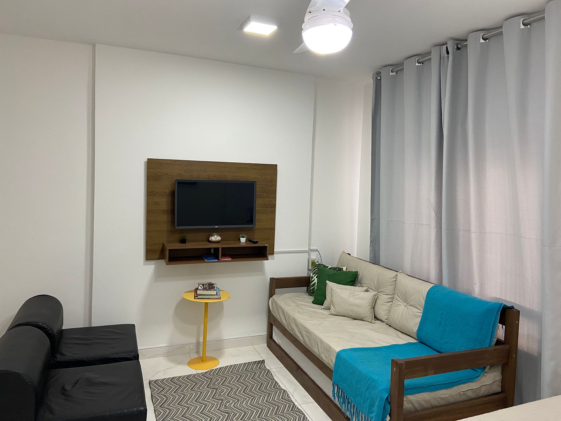 Apto estudio conceito aberto, ambiente integrado quarto-sala, acomoda até 4 pessoas com banheiro e cozinha equipada com vários utensílios.